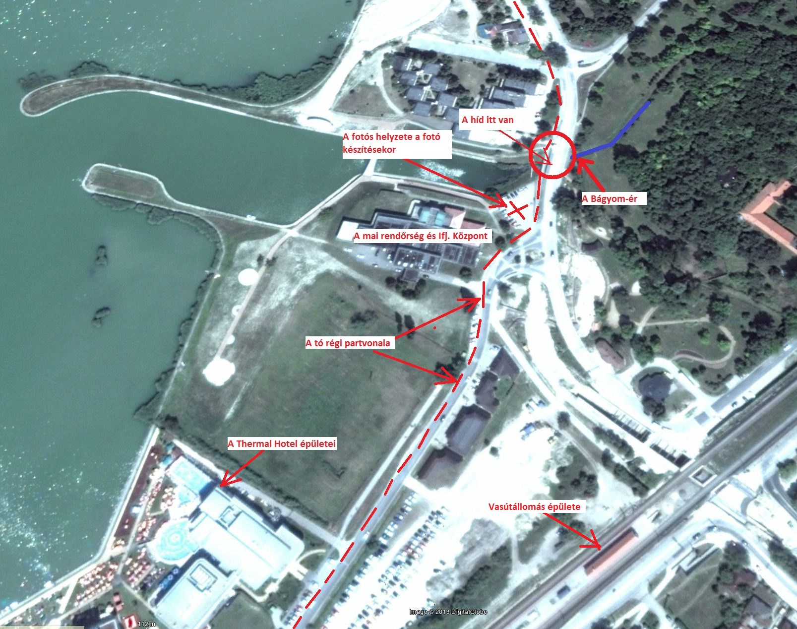 A helyszínen fotózva a rajzot kissé korrigálva arra jutottam, a mai ifjúsági központ galériájának szélén lehetett aznap a vízpart, csak kb. 4-5 méterrel a mai szint alatt!