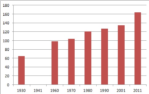 1990-ben a (népszámláláskor jelenlévő) népesség 4.254 fő, 2001-ben 4.979, 2011-ben 5.474 fő volt.