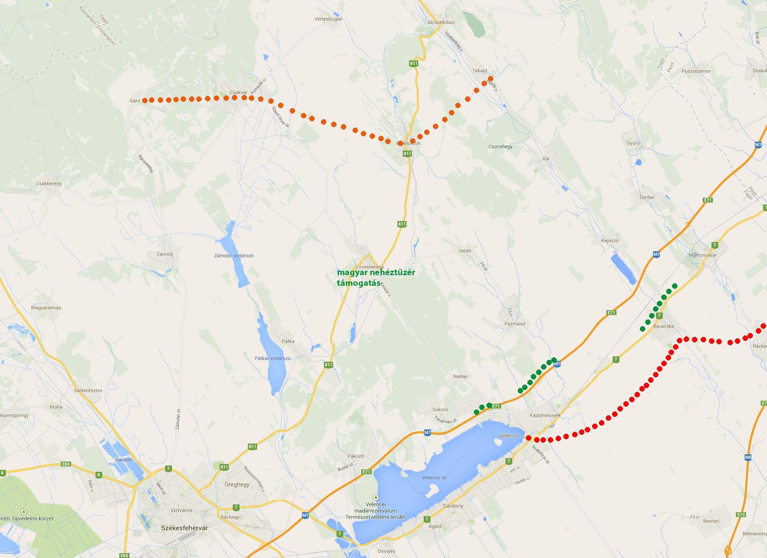 2. kép: A Margit Állás három védőövének rekonstruált helyzete a hozzáférhető hadijelentések alapján Velence-Kápolnásnyék térségében (vörös: a fő védvonal, zöld: a másodlagos védvonal, narancssárga: a harmadlagos védvonal) adatforrások: fő védvonal: Tomka Emil, másodlagos védvonal: Tomka Emil, Veress D Csaba, Sallai Elemér, harmadlagos állás: Veress D Csaba