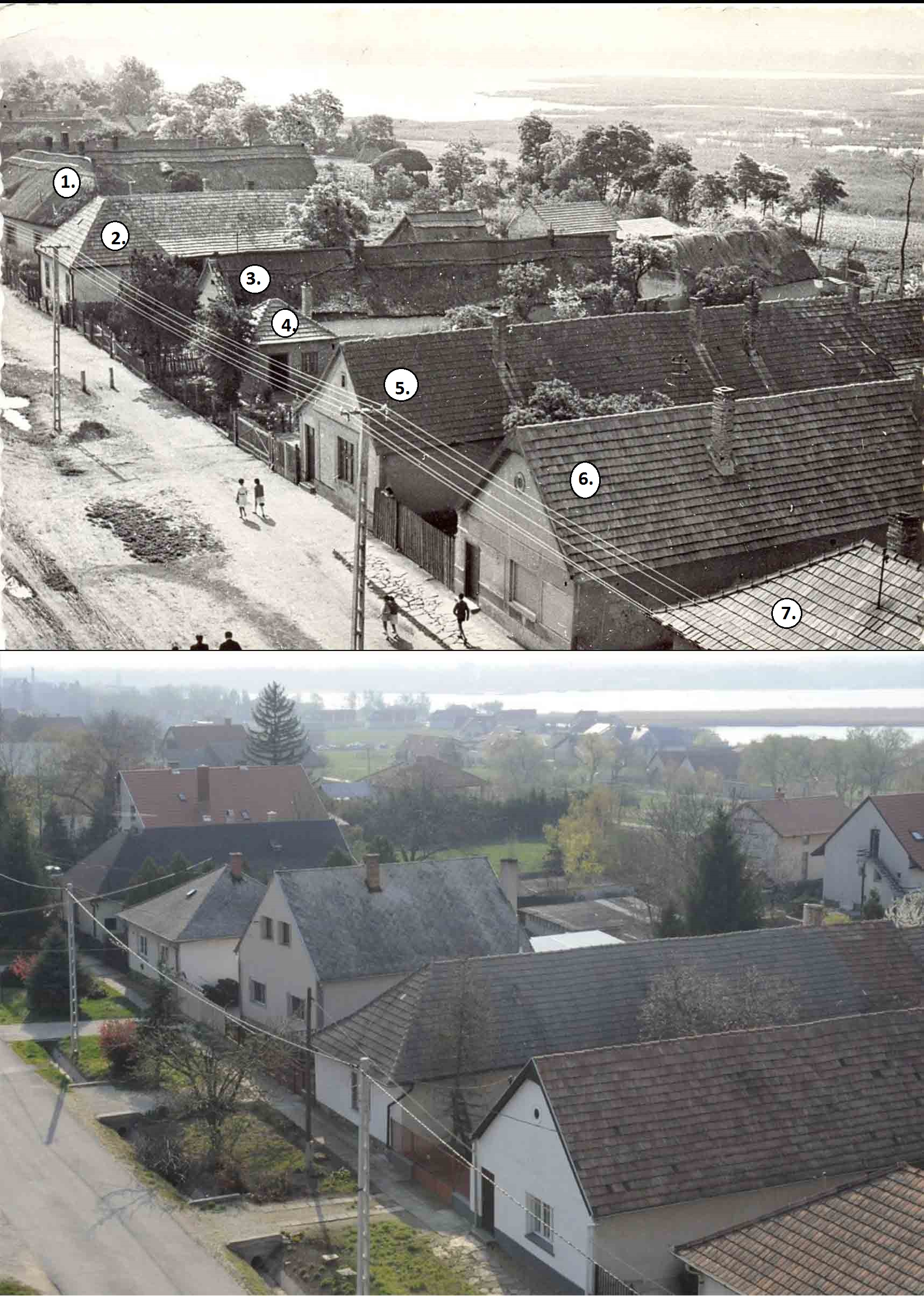 A harmadik régi fotó (5. kép) É-keleti irányú, fókuszában a református templom áll. A fák növekedése mellett szembetűnő a régi képen látható kertes részek beépülése. A régi kép régi házai közül kevés van meg. …