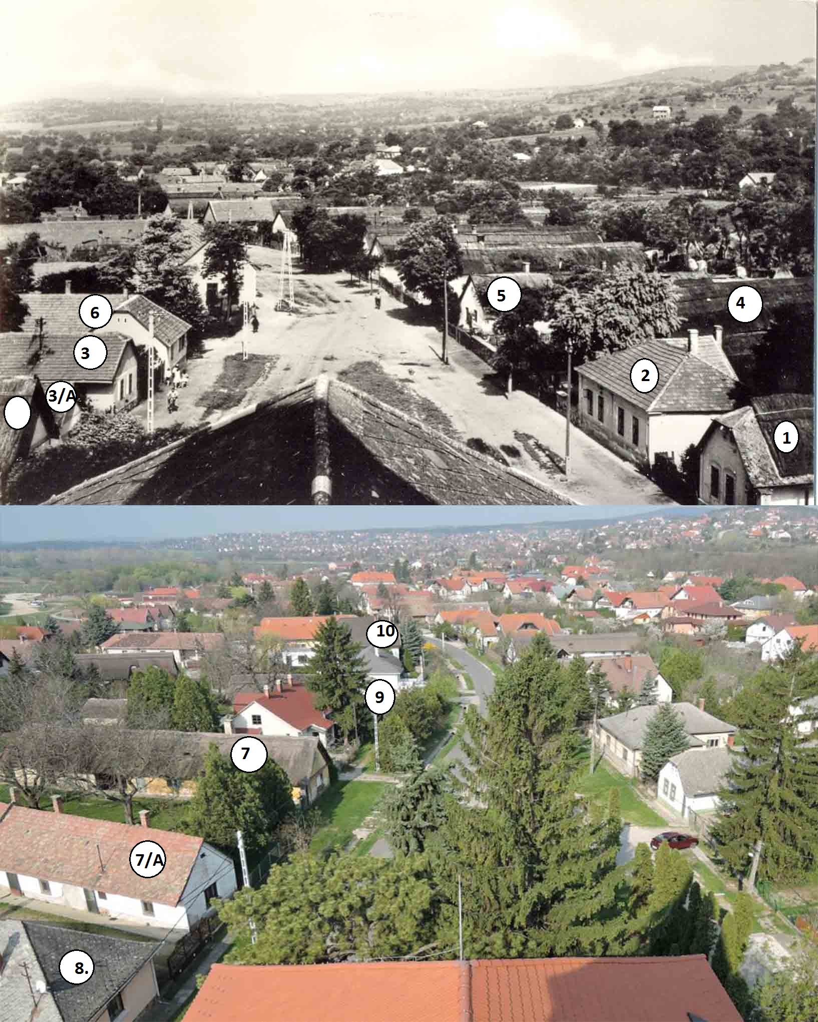 (Megjegyzés: A 7, 7/A és 8. sorszámmal jelölt házak a fotó szögének megváltoztatása miatt látszanak az új fotón. A régin ezeket nem érdemes keresni, látószögön kívül esnek-FÁ)