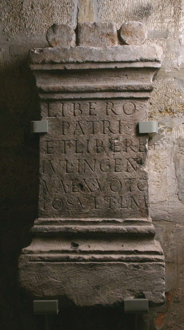 A mészkőből faragott abakusszal ellátott oltárkő felirata a következő a szakemberek szerint: LIBERO PATRI ET LIBERAE IULIA INGENUA EX VOTO POSUIT LIBENS MERITO. A felirat szabad magyar fordításban: Liber pater istennek és feleségének Libera istennőnek, Iulia Ingenua szívesen állíttatta fogadalom beváltása alkalmából az istennek, aki megérdemelte.