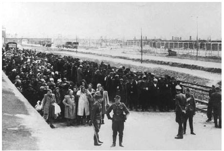 9.kép: A szelekció pillanatai-másoknál, egy hónappal korábban: balról a nők és a kicsik, jobbra a férfiak. A kép előterében jobbra: a sokat emlegetett, elegáns, magas alak, Joseph Mengele. A transzprt mögött a teherautó-a mozgásképteleneknek és halottaknak (forrás: Yad Vashem Intézet)
