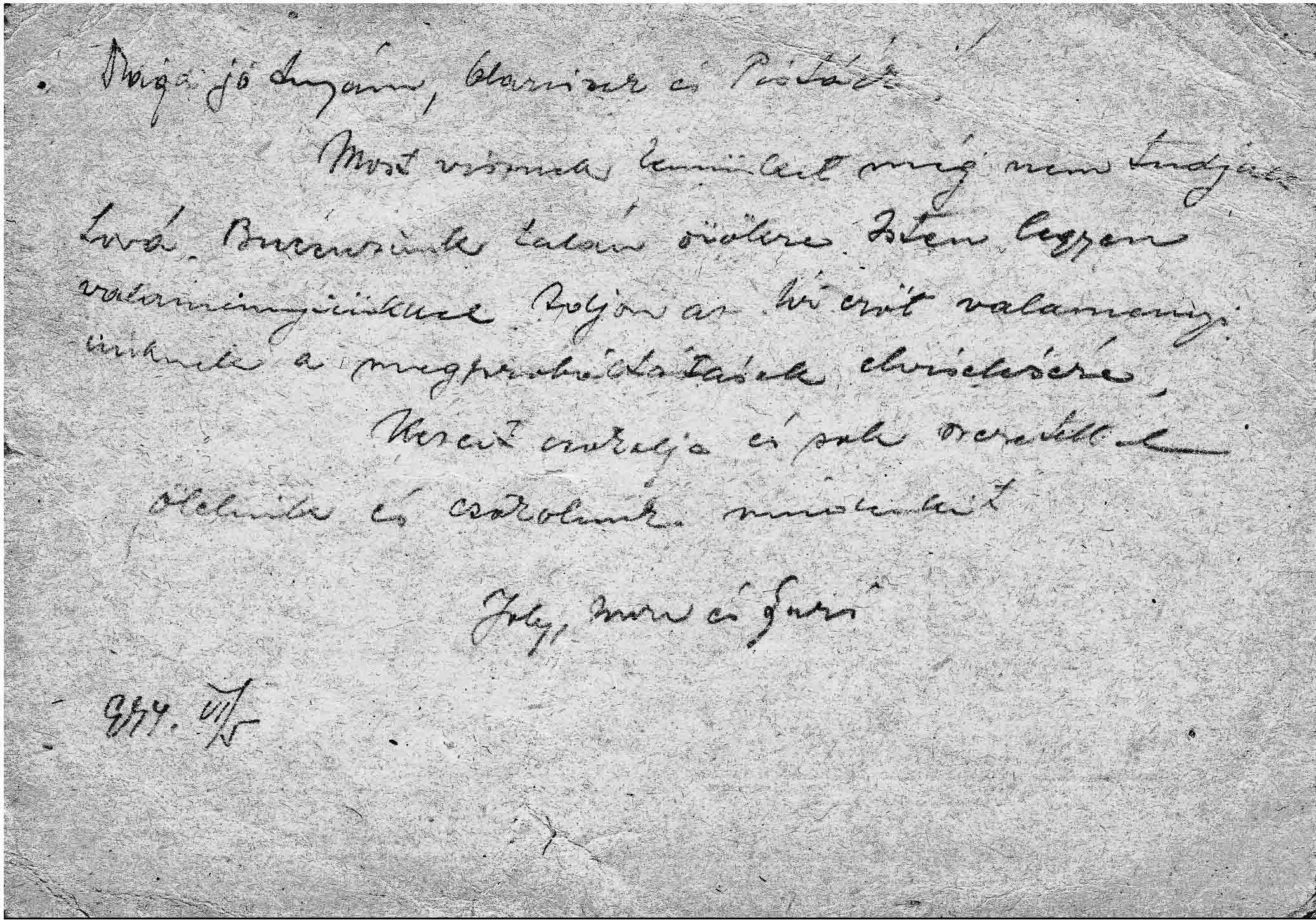 5.kép: Späték vagonból kidobott levelezőlapja A szövege: „Drága jó Anyám, Clarissék és Pistáék ! Most visznek bennünket még nem tudjuk hová. Búcsúzunk talán örökre. Isten legyen valamennyiünkkel. Adjon erőt valamennyiünknek a megpróbáltatásának elviselésére. Kezeit csókolja és sok szeretettel ölelünk és csókolunk mindenkit. 944.VI/5 Joli, Imre és Gyuri”