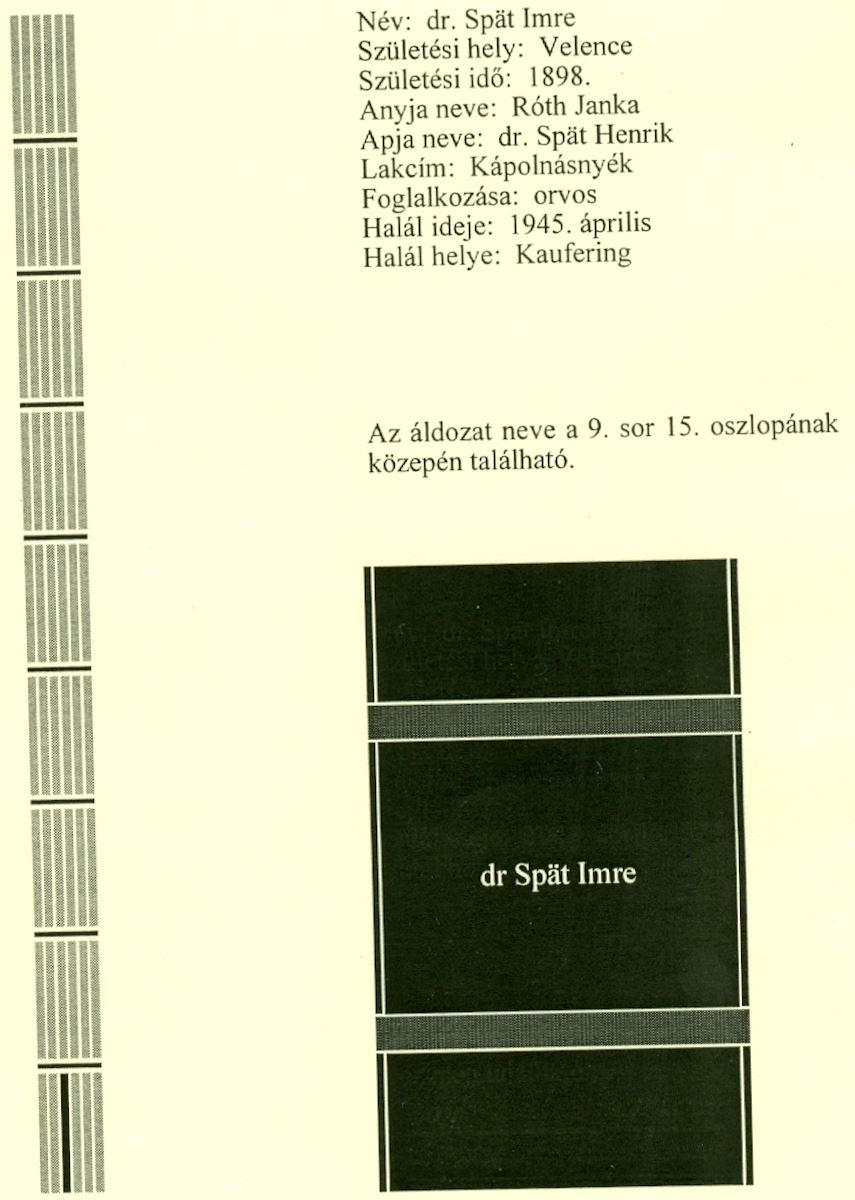 Dr Spät orvosként kivételezett helyzetben volt. Mai tudomásom szerint valamiféle kivételt, mentességet kapott, hivatkozva az orvosi ellátás megoldatlanságára a faluban. Spät azonban apaként és férjként azt a döntést hozta, hogy a kimentést nem kapott családjával tart-és június 5-én felszállt a halál felé induló vonatra.