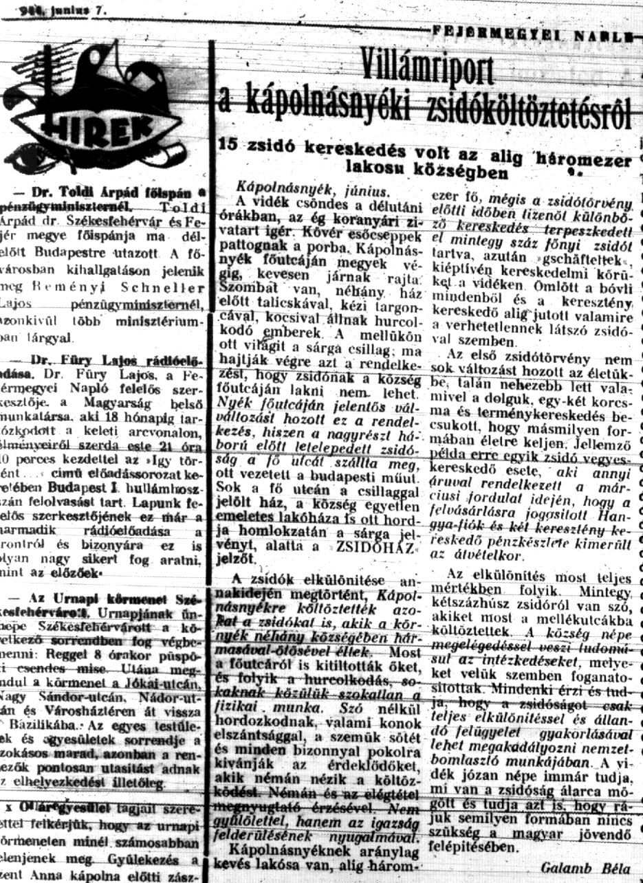 3. kép: A Galamb-féle újságcikk a Fejérmegyei Napló 1944. június 7-i számában. A cikk megjelenésének idejében a kápolnásnyékiek már Székesfehérváron, a Szabó –féle téglagyárban voltak. A cikk tehát durván hazug. Csakhogy ez a szelíd kifejezés egy másik világra van kitalálva.
