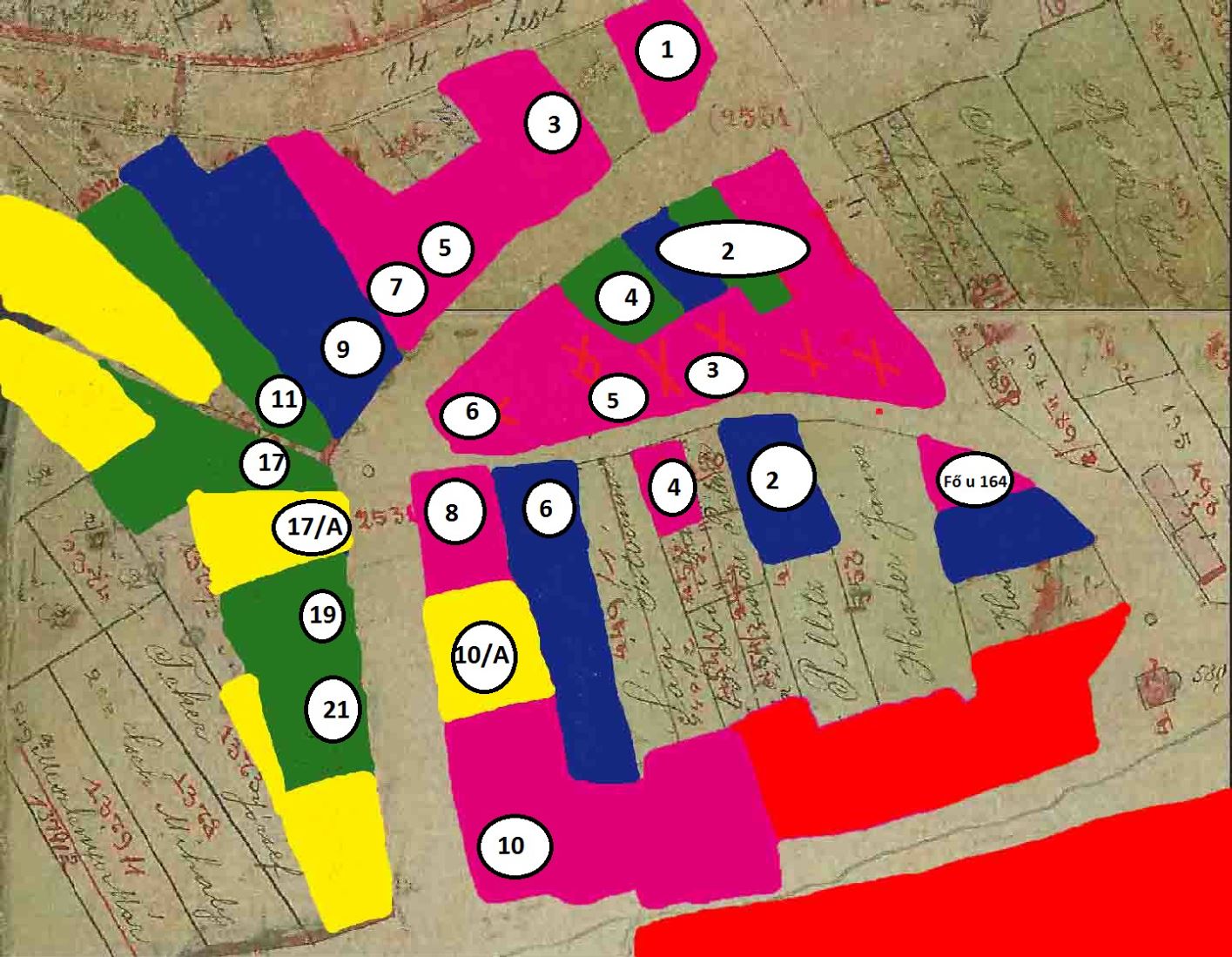 6.kép: Az utca betelepülése az 1880-as kataszteri térképen. Piros szín: 1782-ben már lakott. Pink szín: 1880-ban már lakott. Kék: 1927-ben lakott. Zöld: 1950-ben lakott. Sárga: jelenleg beépített.