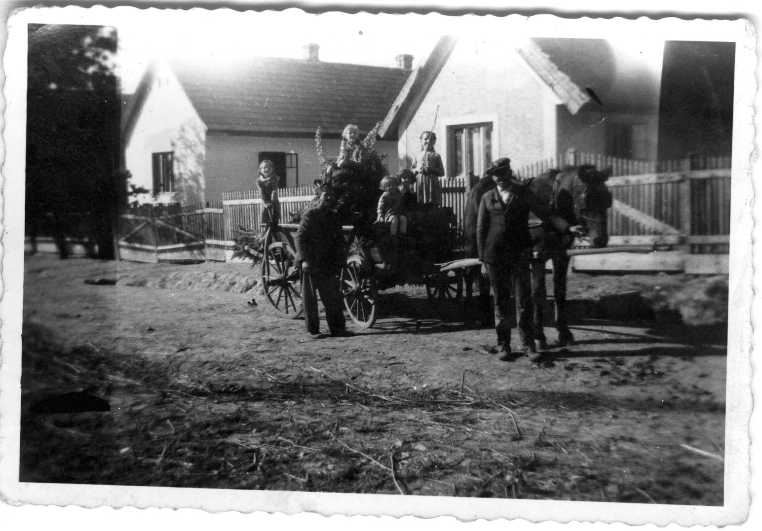 7. kép: 1943-as utcakép szekérrel, felnőttekkel és gyerekekkel. A lovakat talán Pintér úr tartja (környékbeli) (forrás: a Faragó család gyűjteménye) Nagyításért kattints a képre!