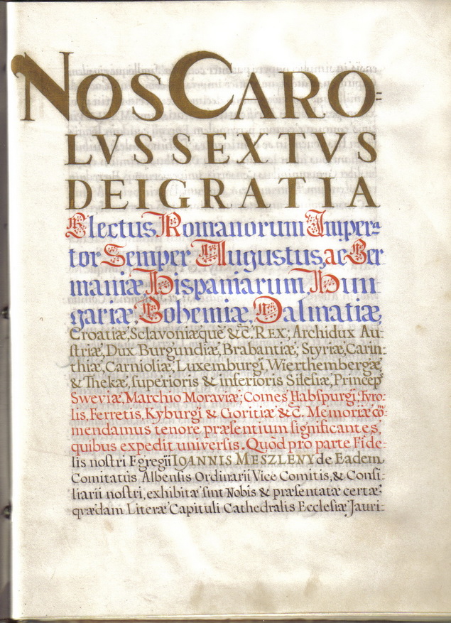 3. kép: A III. Károly által készíttetett donációs 1924-es donációs levél első lapja (forrás: Meszleny Ignác, Meszleny Benedek)