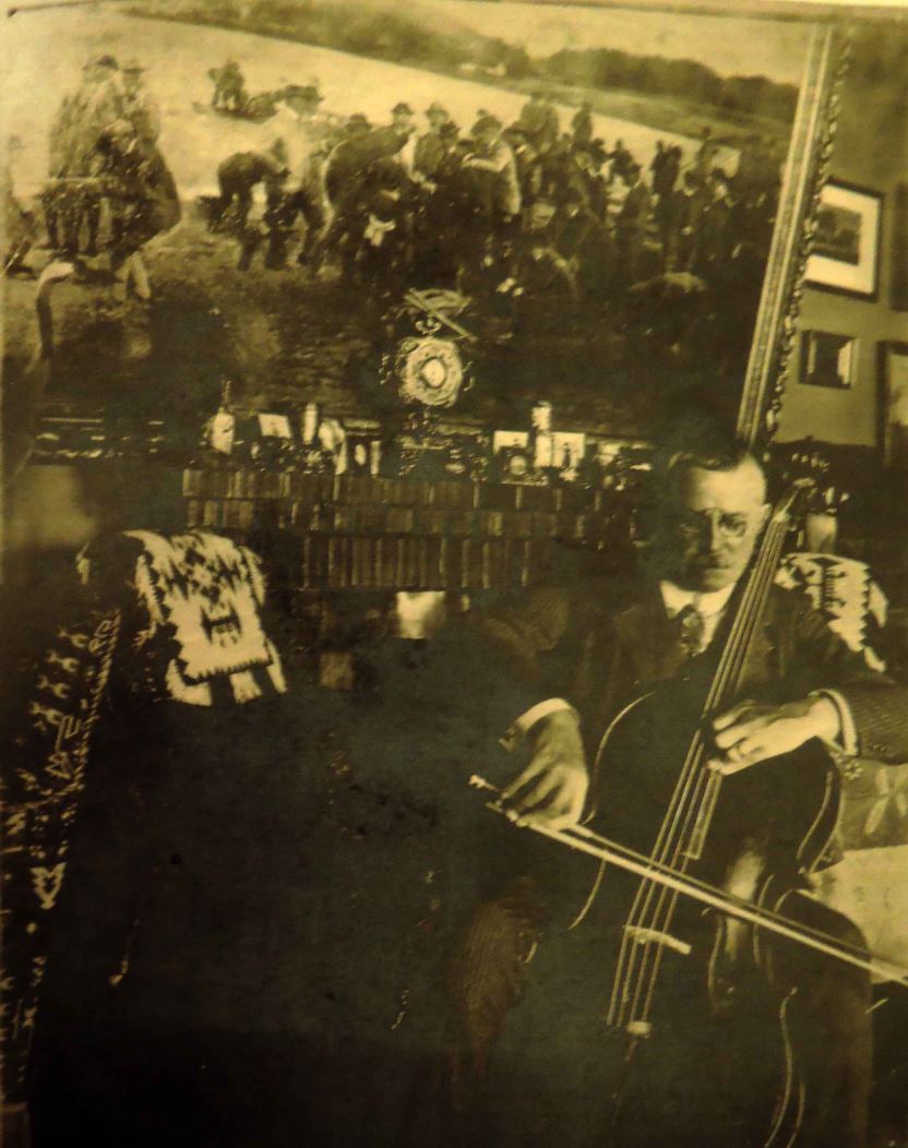 (MB és FÁ Sárváry Mariann könyvét lapozzák, FÁ lefotózza azt a képet a könyvben, amin Meszleny Benedek látható gordonkázás közben, fölötte a kép eredetije.)