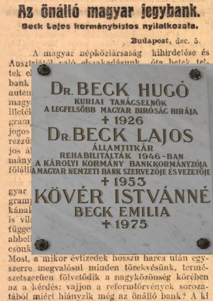 6.kép: Az önálló magyar jegybank létrehozásával kapcsolatos nyilatkozata a Budapesti Hírlap 1918. december 5-i számában-Beck ennek létrehozását tekintette fő művének-ez áll a neve alatt a Beck kápolnában is. (Nagyításért kattints a képre!)