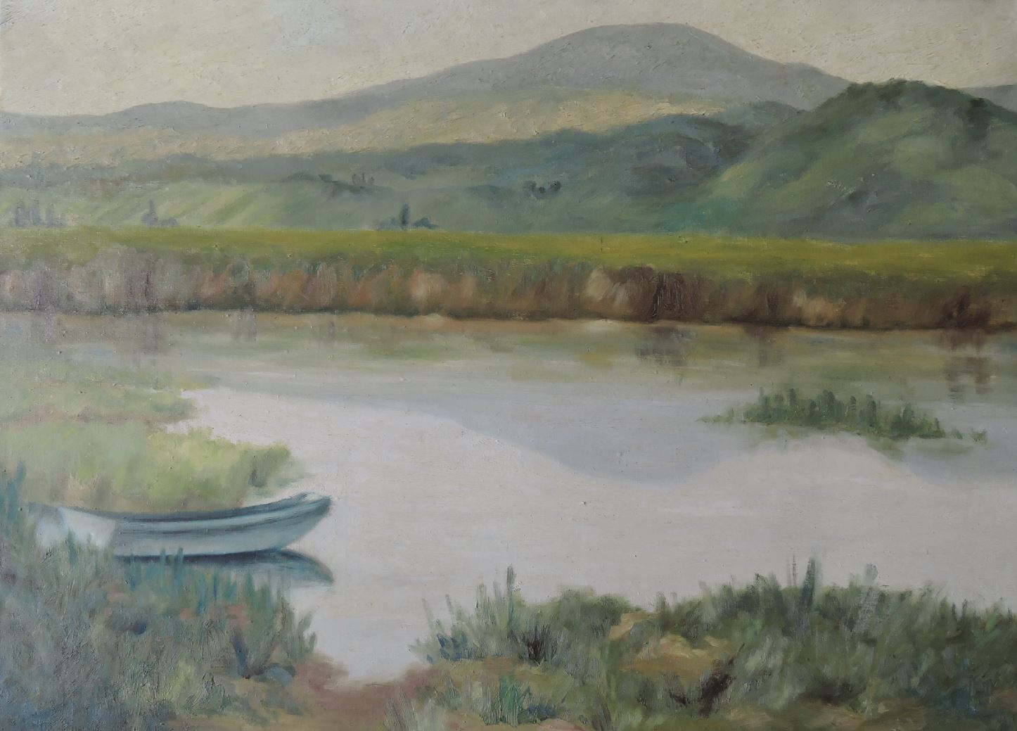 Éva néni festménye az északi oldal dombjairól a Süle kanyarból (nagyjából a Velence-Velencefürdő közötti vasúti átjáró vonalából) nézve