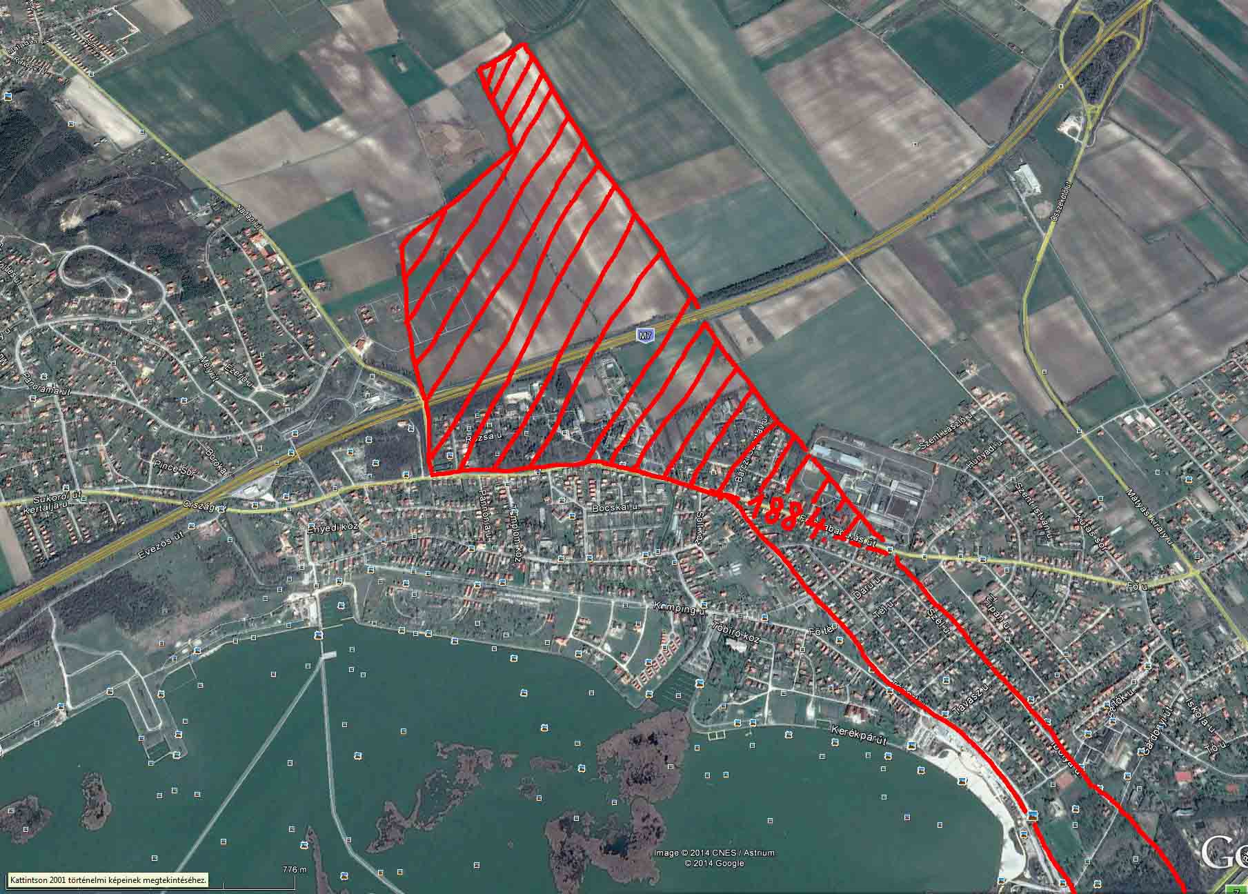 A Google Map részlete rajta az idő közben bekövetkezett változások jelzése. Az északi terület mezőgazdasági művelés alatt maradt, a belterületté vált déli rész többnyire kert és háztelek 1884-ben (Nagyításért kattints a képre!)