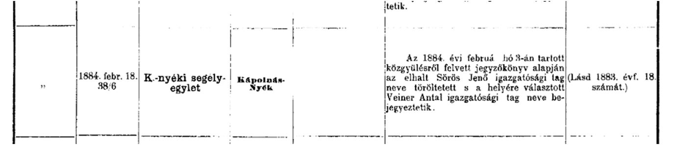 A Központi Értesítő 1884. március 2-i száma Veiner Antal nevével