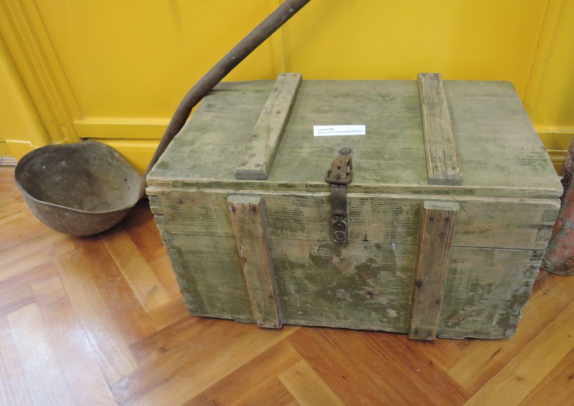 A Berta testvérek velencei illetőségű háborús relikviáiból kettő: itt készült lőszeres láda, rohamsisakból „épített” pöcegödör-tisztító