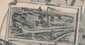 És most vegyük szemügyre a képes levelezőlap bal felső sarkában látható madártávlati rajzot, amely egy valóban impozáns, városias ipartelepet ábrázol – a kép kissé gyanúsan impozáns is…