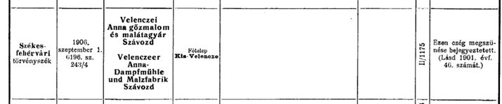 1896-tal végképp befejeződött a malom dicsőséges, „lisztes” korszaka, és valami újabb kezdődött: a liszté és malátáé. Erről, és az I. világháború viszontagságairól szól ez a bejegyzés. Az 1896-os Központi Értesítő az alábbi bejegyzést közölte: „Sz-fehérvári törvényszék: 1896. jan.30. 778. sz. 243/1. Velenczei Anna Gőzmalom Stern Velenczeer Anna Dampfmühle Stern Főtelep Kis-Velencze tul: Stern Arthur, Kis-velenczei lakos, malomiparos” A malom történetével kapcsolatban Stern Arthur neve 1887. márciusától került elő első alkalommal. Ekkor a cégvezetők között jelent meg. A Kuhner-Back-Bloch –klánnal való kapcsolata azonban ennél régebbi keletű. David Kuhner, a malom első iparos tulajdonosa ugyanis a nagybátyja volt, de az sem kizárt, hogy a családi kapcsolatok egy generációval korábbiak. Erről bővebben ITT olvashatsz.
