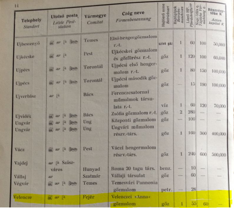 Az 1908-as címtár-kiadvány Anna malmot is tartalmazó oldala