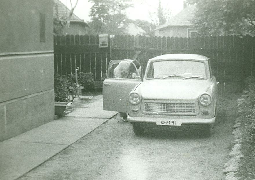 Az első autónk, egy Trabant, ami nagyon sokmindent kiszolgált, amint éppen megérkezünk vele Debrecenbe. Máig emlékszem a rendszámára: IF 14-63[15]