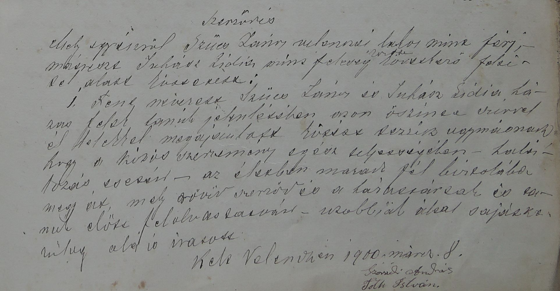 Mely egyrészrül Szücs János velenczei lakos mint férj- másrészrül Juhász Szófia mint feleség között a következő … alatt … : 1.Fent nevezett Szücs János és Juhász Szófia házas felek tanúk jelenlétében azon őszinte érzéssel és … … hogy a közös szerzemény egész teljességében halálozás esetén-az életben maradt fél birtokába megy át. Mely szerződés halál előtt felbonttatik helyben hagyásra sajátkezüleg alá is irattatik. Kelt Velenczén 1900. márczius 8. Szórádi András Tóth István” |