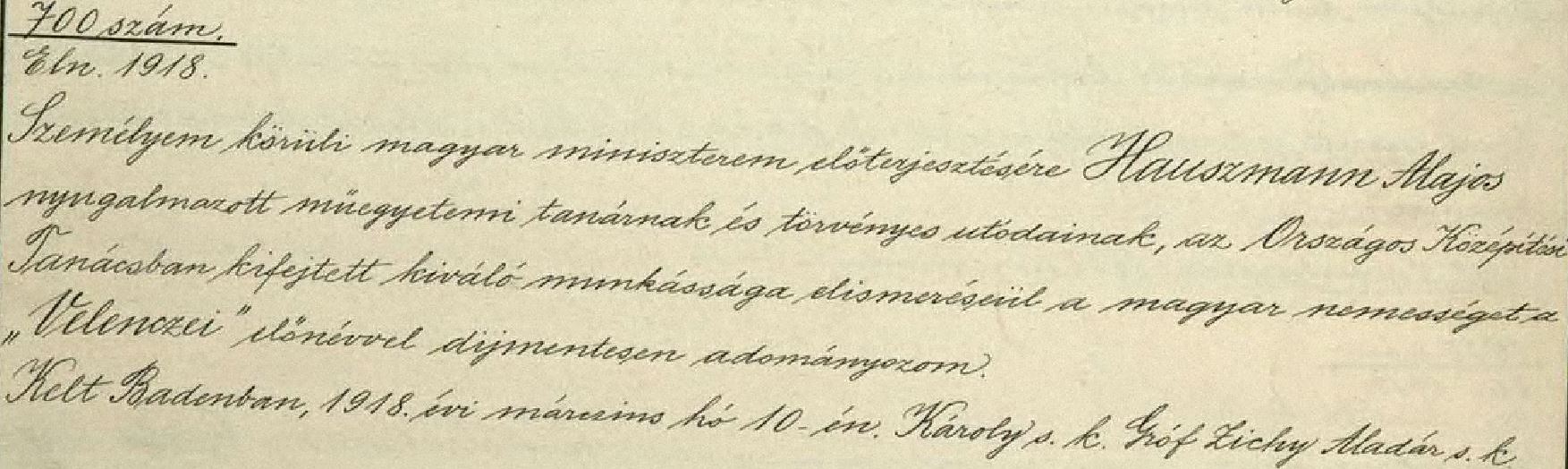 A „Királyi Könyvek” 1918. március 10-i bejegyzése 700-as szám alatt Hauszmann nemességéről-forrás: Arcanum.hu- Nagyításért kattints a képre!