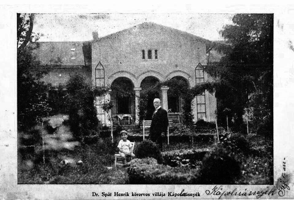 Az első, becslésem szerint 1924-26 közötti fotón Spät Henrik, felesége, Róth Janka és lányuk Klarisz látható. A ház még nagyon újszerűnek hat, de ez esetleg mással is magyarázható. A kép kompozíciója is sokatmondó. A fotós felé tekintő anya és lánya, a feléjük forduló (rájuk mutató) apa, háttérben a nagy ház, legalább annyira Spät Henrik élete mérlege, mint képeslap emberi arcokkal. Talán arról szándékozik szólni, hogy Spät messziről jött és messzire jutott.