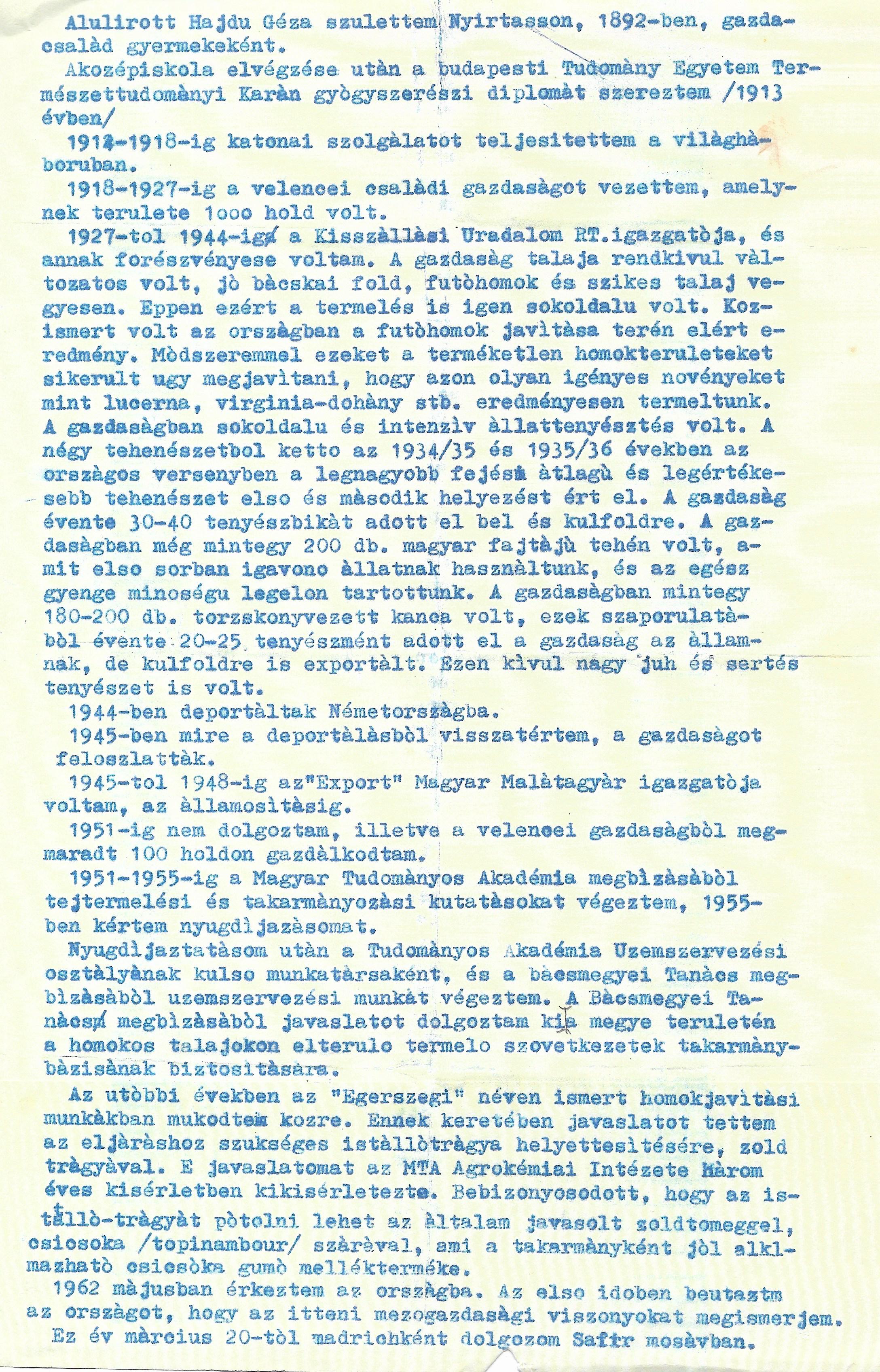 Alulírott Hajdu Géza születtem Nyírtasson, 1892-ben, gazdacsalád gyerekeként.