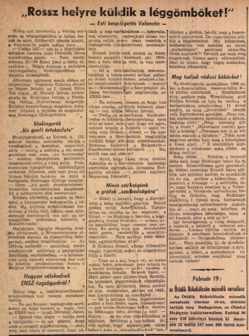 Stokingeréknél, az Enyedi u. 131[1]. számú házban esténként várják a vendégeket: a komákat, sógorokat, akik — mióta a politika a mi országunkban már nem „úri huncutság“ — sokszor összejönnek politizálni, meghányni-vetni a világ sorát. Valamennyien újságolvasó, rádióhallgató emberek. Olyanok, akik már jóval túl látnak falujuk határán és mint a házigazda, Stokinger György mondja’: — ilyen „kis genfi értekezleteken“ kicserélik véleményeiket, megbeszélik a nemzetközi élet eseményeit…