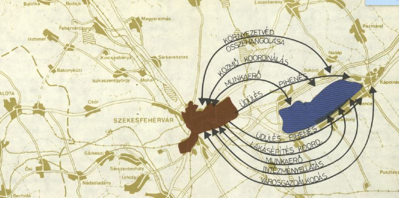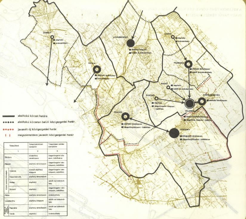A tervezet 53. oldalán és más helyeken Gárdonyt és Velencét jelölték meg alközpontokként. Pázmánd, Kápolnásnyék és Sukoró e szerint Velencéhez konvergálhatott volna. (Valami hasonló aztán, a kilencvenes évek legelejéig meg is valósult) Szándék szerint Kis-Velence, Velencefürdő Gárdony közigazgatási területe lett volna. Megjegyzem, ez a téma újra és újra előkerül, bár a mozgatórugók változékonyak. Hol a földbirtokosság, hogy a szerveződő üdülőközönség, hol a tervezők mozgatnák jelentősen a településhatárokat, vele a hatalmi és függőségi viszonyokat, fejlesztési forrásokat, figyelmet a települések között. Hol körültekintően, hol nem.
