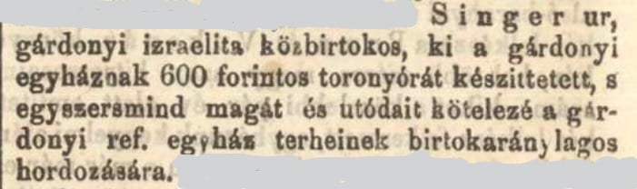 „Singer úr, izraelita, gárdonyi földbirtokos, az ottani ref. templom tornyába 600 frtos órát készíttetett, s a ref. egyház terhei birtokaránylagos hordozását saját s utódai nevében elvállalja. „