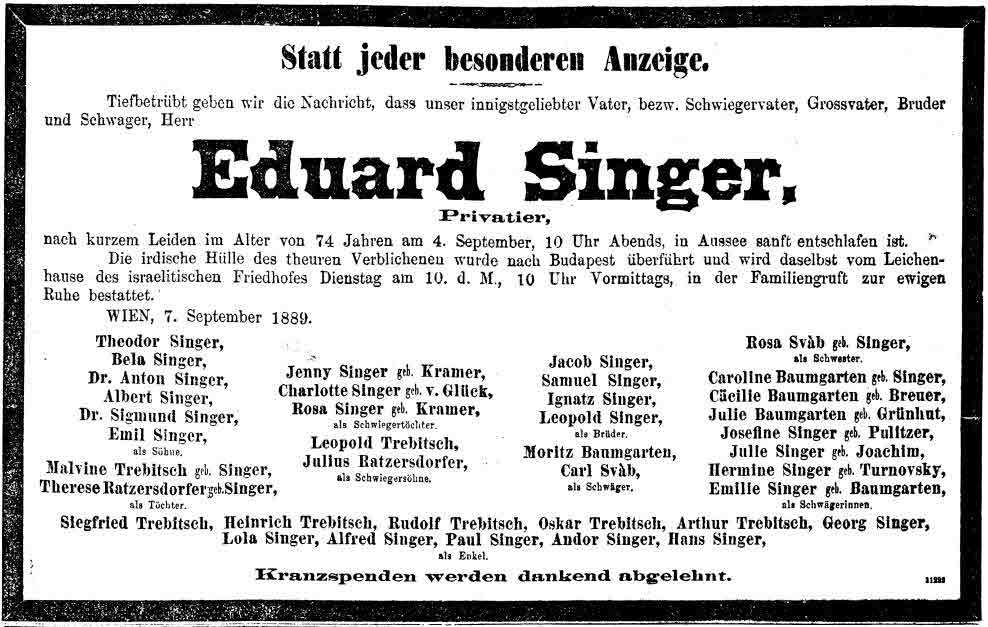 Singer Eduard („Edéről”) nincs általam fellelhető fotó. A Geni adatbázisban található gyászjelentése az egyetlen, amit találtam-FÁ Ebből azonban a személyes kapcsolatok rendszere egyértelmű.