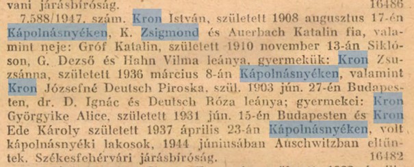 Kron Zsigmond (1872.02.24-1933.?) velencei születésű, kápolnásnyéki illetőségű honfitársunk. Egyike talán azoknak, akik sok más valamikori lovasberényi zsidó útját járva először Velencén, majd Kápolnásnyéken telepedtek le. Érdekes pálya ez, egyelőre nem ismerem még az értelmét. Ide tartoztak például a Singer/Gárdonyok.