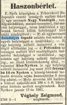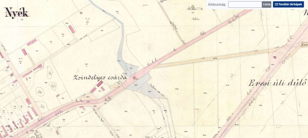 Kresz Mária (Kápolnás)Nyék tanulmányában így írt róla (pontatlanul): „…Nyék keleti részén a Gárdonyba vezető út elágazásánál szállás az uraknak, és a falu nyugati végén a Zsindelyes csárda, utóbbi már csak a régi térképeken van feltüntetve.”