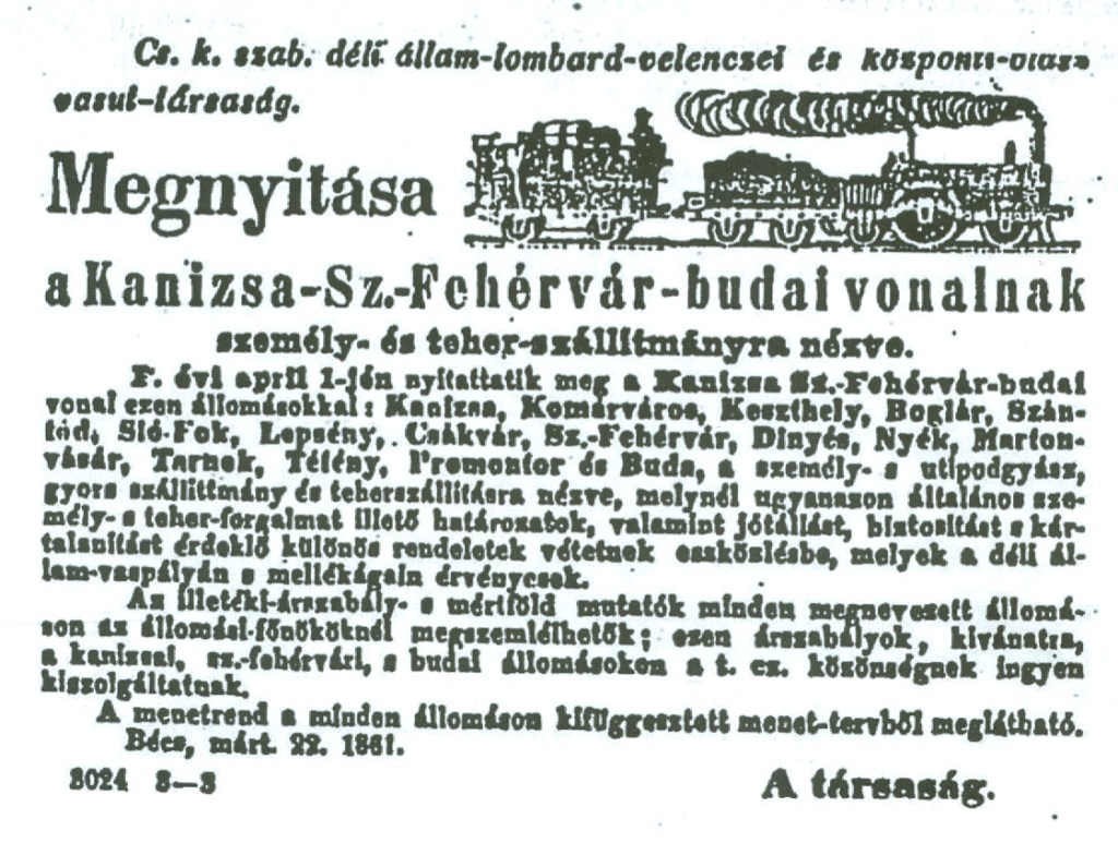 Bejegyzésem szempontjából az a fontos, hogy köztük volt a „Ofen- Stuhlweissenburg- Gr. Kanifcha- Agram”; azaz Buda-Székesfehérvár-Nagykanizsa-Zágráb vonal is. A földmérők 1848-as vármegyei megjelenése után ez volt a vasútvonal építéséhez vezető második nagy lépés.