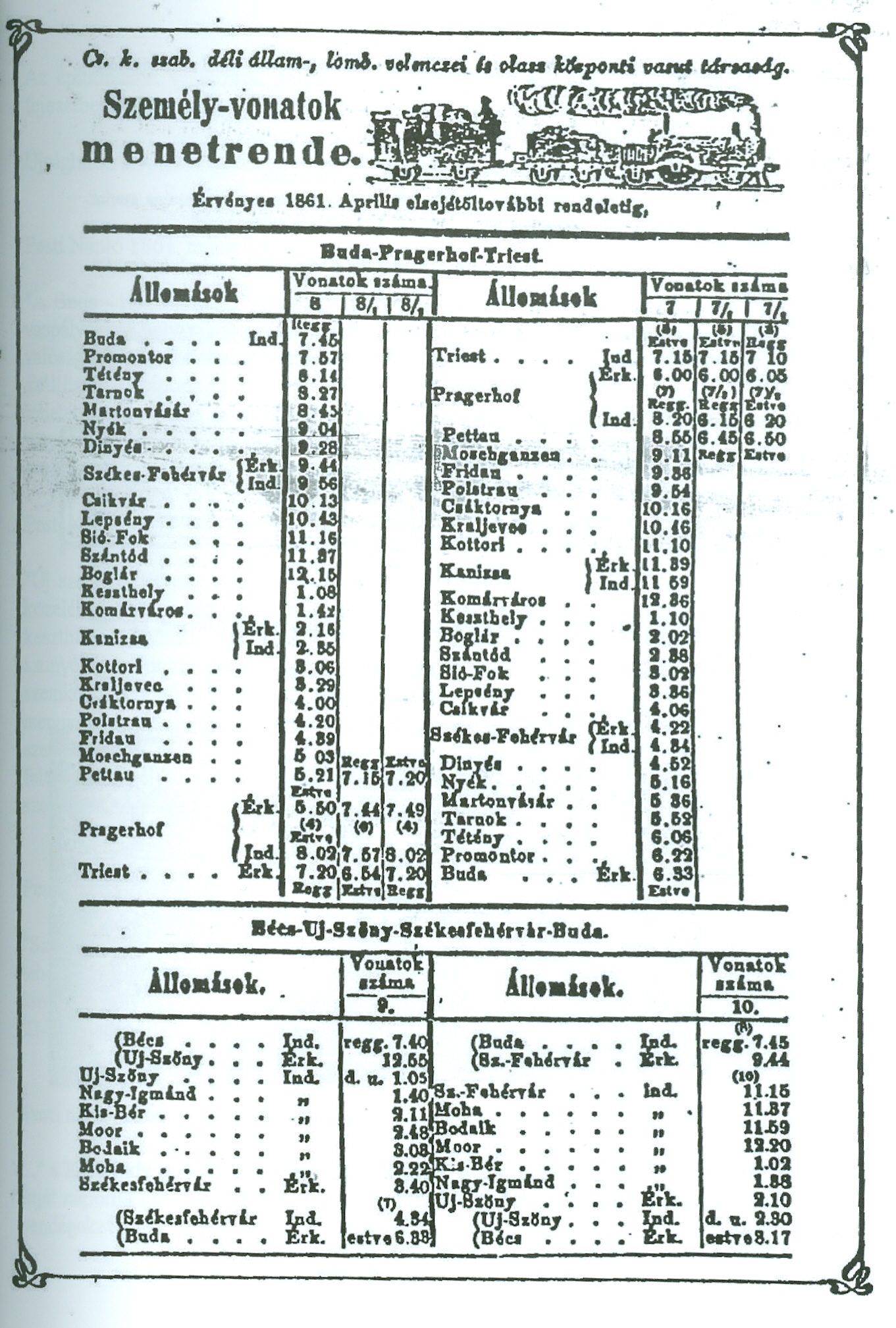 Buda és Székesfehérvár között 1861-ben 6 megálló volt: Promontor (Budafok), Tétény, Martonvásár, Nyék, és Dinnyés. A hozzánk legközelebb eső Nyékre a személyforgalmi menetidő Budáról 79 perc volt.