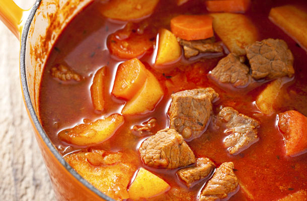 mindig tartalmas, bőségesen zöldséges, fűszeres, színes, ízes volt. Anya tésztát is főzött bele. Köményt csak „Macsák Icukaként” teszek bele, együtt párolódik a hagymával, hogy pattogó hangot adva kiadja az ízét. Közben megtanultam azt is, a marhahús színe elárulja a korát. Minél öregebb az állat, annál mélyebb a hús színe, annál később fő puhára. Ha másfél óránál tovább kell főzni, a piros paprikának csak kisebb részét szabad a hússal együtt beletenni, mert a színét-ízét veszti. Java részét a főzés vége felé használom fel. Csokorba kötött zellert, és petrezselymet használok hozzá, de ezeknek is elég fél-negyedóra főzés a végén, hogy az ízük megmaradjon.