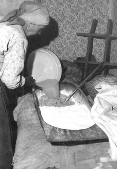 Drága Nagymamáméknál Hajduböszörményben hetente egyszer sült a kenyér, kovásszal, kemencében. Mindig volt valami ünnepélyes hangulata annak a napnak. már az előkészületek is: a nagy dagasztóteknő, szita, szakajtókosarak, kendők, hófehér terítő elővétele. Aznap nagyanyám Erzsike és Juliska néném korán kelt. Ők dagasztották a kenyeret, én csak nézelődhettem. A hosszú teknőben egyben kelt a kenyértészta letakarva. Mikor jónak látták, „kiszakították”, annyi darabra, ahány kenyeret akartak. Kerekre formázva helyezték a szakajtókosarakba.