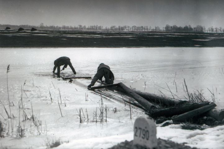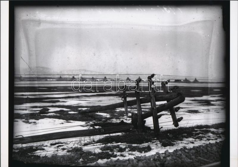 Külön figyelmet érdemel az alábbi kép. Ezen, bár halványan, a kép bal oldalán hegyvonulat látszik. A kidőlt távíróoszlop és a dombok között felhalmozott nádkévék, jó messze. Ezen a képen, jobbra alul látszik a sín. Ehhez hasonló téli látvánnyal gyermekkoromban találkoztam Dinnyés felé, a tóra tekintve. Más körülmények is illenek ide, csakhogy…