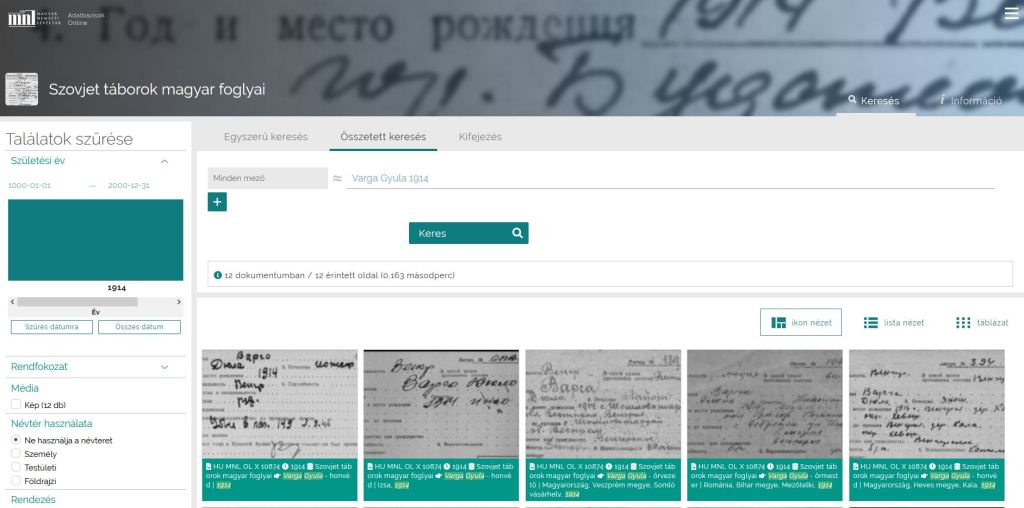 Az adatbázist megtalálva kimondottan egyszerű lekérdező felület látható. Bátran használd! Nagyapa adataival kísérletezve (1914, Varga Gyula)  12 találatot adott ki. Közülük azonban csak 2 fogoly származott Bihar megyéből. Míg Nagyapa Mezőtelegden született, névrokona méhesi volt. Igaz, Nagyapa kartonjára Mezőtelkit értett a számítógépes program (olyan is van Bihar megyében), de az apa keresztneve (oroszul) Nyikolaj/Miklós megint stimmelt.