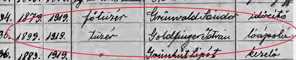 A szép, kalligrafikus betűkkel írt névjegyzék egy neve illik leginkább a képeslap – monogram mögé, bizonyos Goldfinger István tüzér, lóápolóé, aki 1899-es születésű volt, és 1919-ben vonult be az alakulathoz. Nagyjából húszéves volt az a fiú, amikor1919 májusában belépett a Süszmann boltba.
