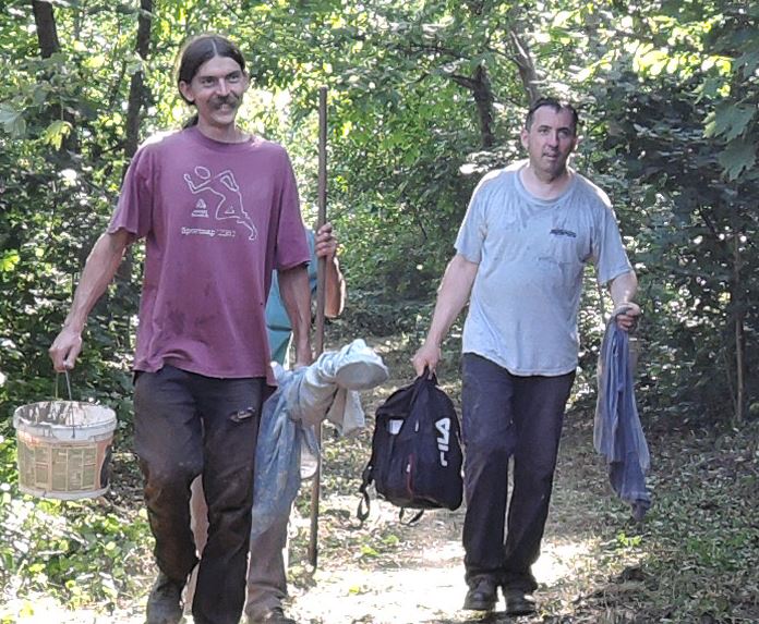 Károly barátom (balról) és Meszleny Benedek (jobbról) a Meszleny -temető rendberakásának végén, egy nagyon meleg 2014. augusztusi napon. Egy bemutatkozásnál talán előkelőbb, “nyakkendős” kép a megszokott, az viszont kevesebbet árulna el Károlyról. Nekem az a fontos, hogy jó vele dolgozni (izzadságosan is) és ezt kevesen mondhatják el magukról.
